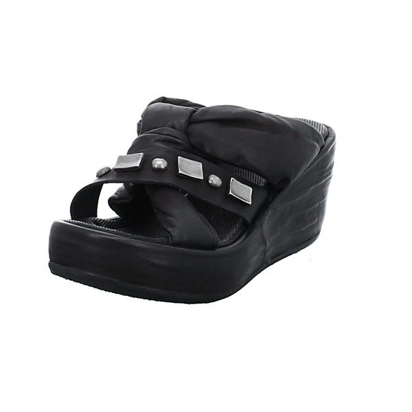 Die Pantolette Arca von A.S.98 überzeugt mit weichem schwarz gefärbtem Rindsleder, modischen Nietendekor und einem schönen Keilabsatz. Im angesagten Ethno-Look wird sie mit Sicherheit der neue Liebling der Saison.