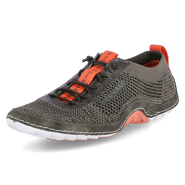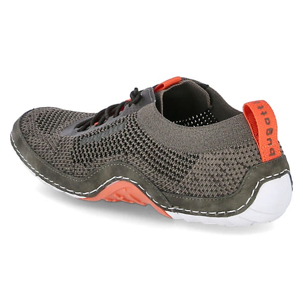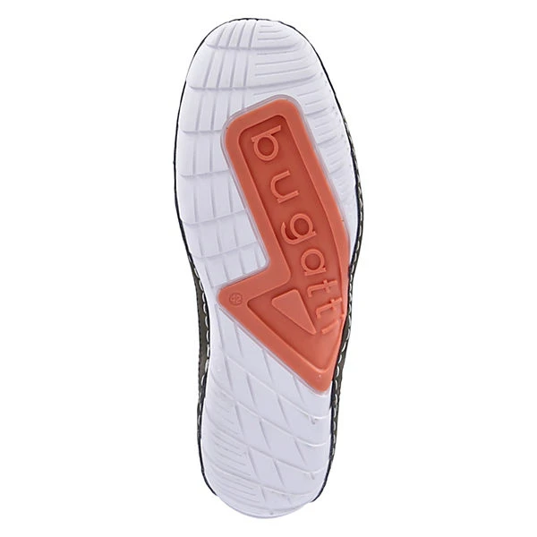 Mit den leichten, trendigen Low Sneakern von Bugatti wird die warme Jahreshälfte für Herren zu einem luftigen Wohlfühlerlebnis. Die grünen sportlichen Slipper sind aus einem Textil-Synthetik-Mix mit stretchiger Oberfläche in Feinstrickoptik hergestellt. Das Elastikband in Schnüroptik über dem Spann sorgt für flexible Passform und durch die zwei gelabelten orangen Anziehlaschen wird der Ein- und Ausstieg erleichtert. Für guten Tragekomfort der Slip-on-Sneaker sorgen eine gut gepolsterte Decksohle und die sehr flexible, rutschhemmende Laufsohle.