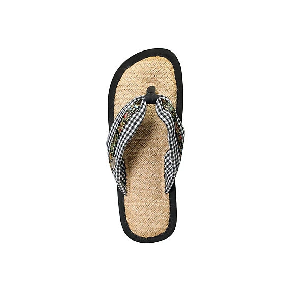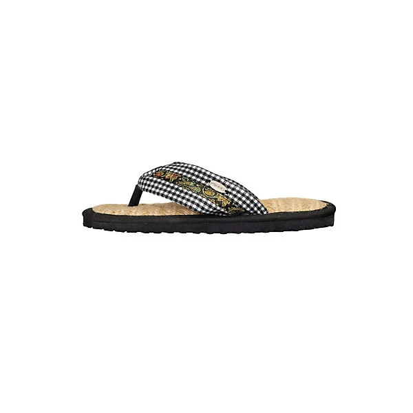 Die Oberriemen aus schwarz-weiß karierter Baumwolle wurden doppelt gelegt und vernäht, somit sind sie angenehm gepolstert und schmiegen sich sanft dem Fuß an. Eine dezent bunte Litze im asiatisch-floralem Design ziert zusätzlich den Riemen und verleiht der Sandalette einen besonderen Touch.