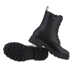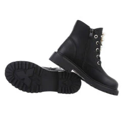 Flache Stiefeletten Lochschnürung, Blockabsatz, Perlen – Schwarz